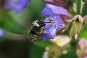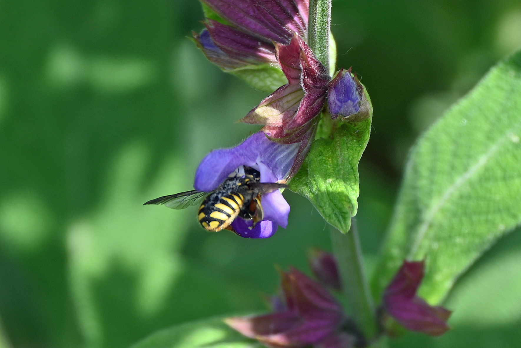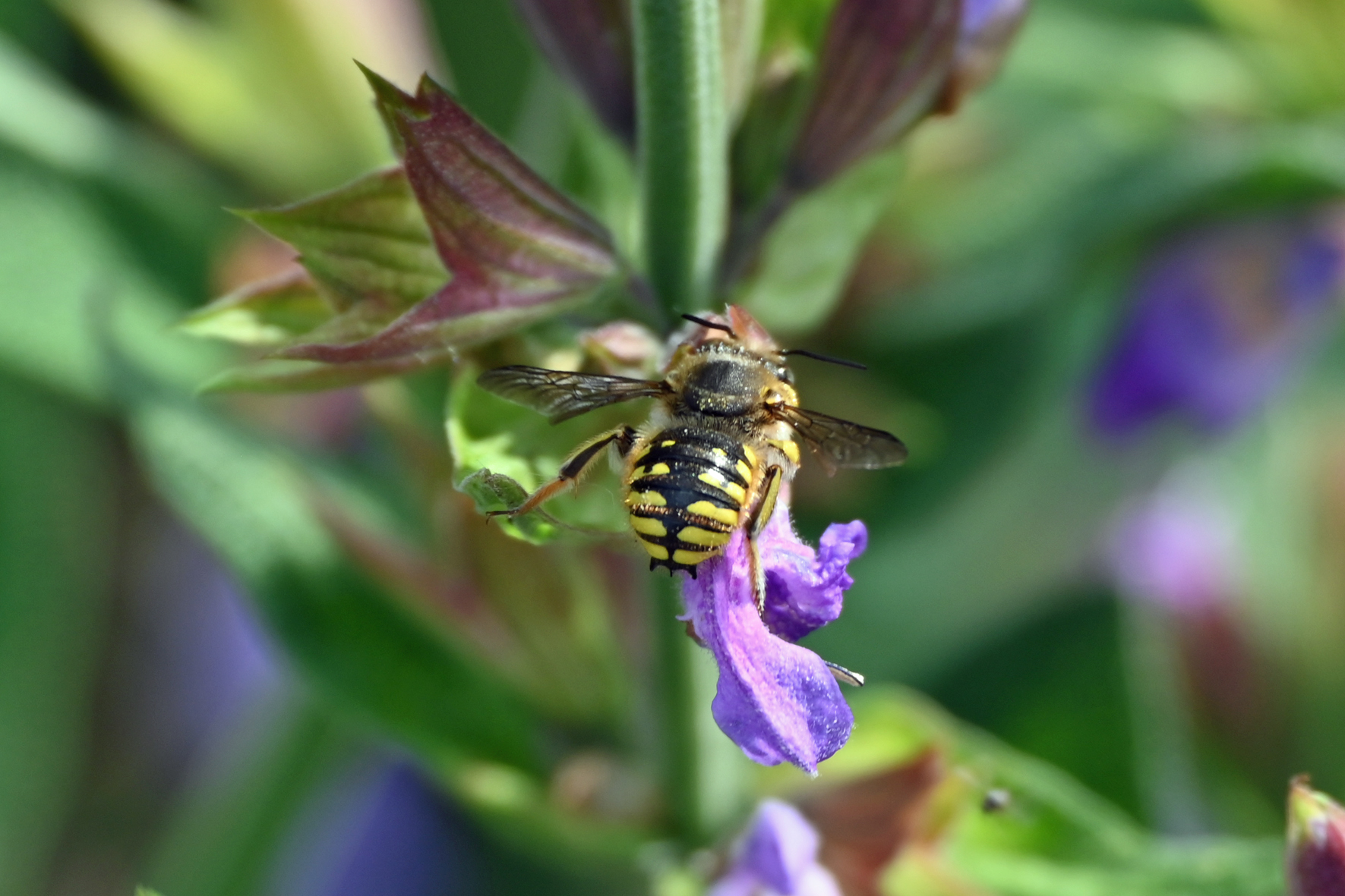 Die Garten-Wollbiene oder Große Wollbiene (Anthidium manicatum) fliegt von Juni bis in den Spätsommer hinein. Sie ist eine Bauchsammlerin und lebt solitär, bildet also keine Staaten. In vielerlei Hinsicht ist sie bemerkenswert. Sie beherrscht den Schwirrflug, kann also ähnlich wie ein Kolibri, vor einer Blüte in der Luft stehen. Die Männchen sind größer als die Weibchen, was bei den Wildbienen in der Regel eher anders herum ist. Das ist aber vielleicht notwendig, da die Männchen ein ausgeprägtes Revierverhalten besitzen. Sie besetzen Reviere mit den bevorzugten Blütenpflanzen und vertreiben alle Nahrungskonkurrenten mit Ausnahme der Wollbienen-Weibchen. Zur Verteidigung dienen die Dornen am Hinterleibsende. Die Wollbienen-Weibchen bauen ihre Nester in kleinen Hohlräumen und polstern diese mit abgeschabten Pflanzenhaaren aus, z.B. vom Roten Fingerhut (Digitalis purpurea).