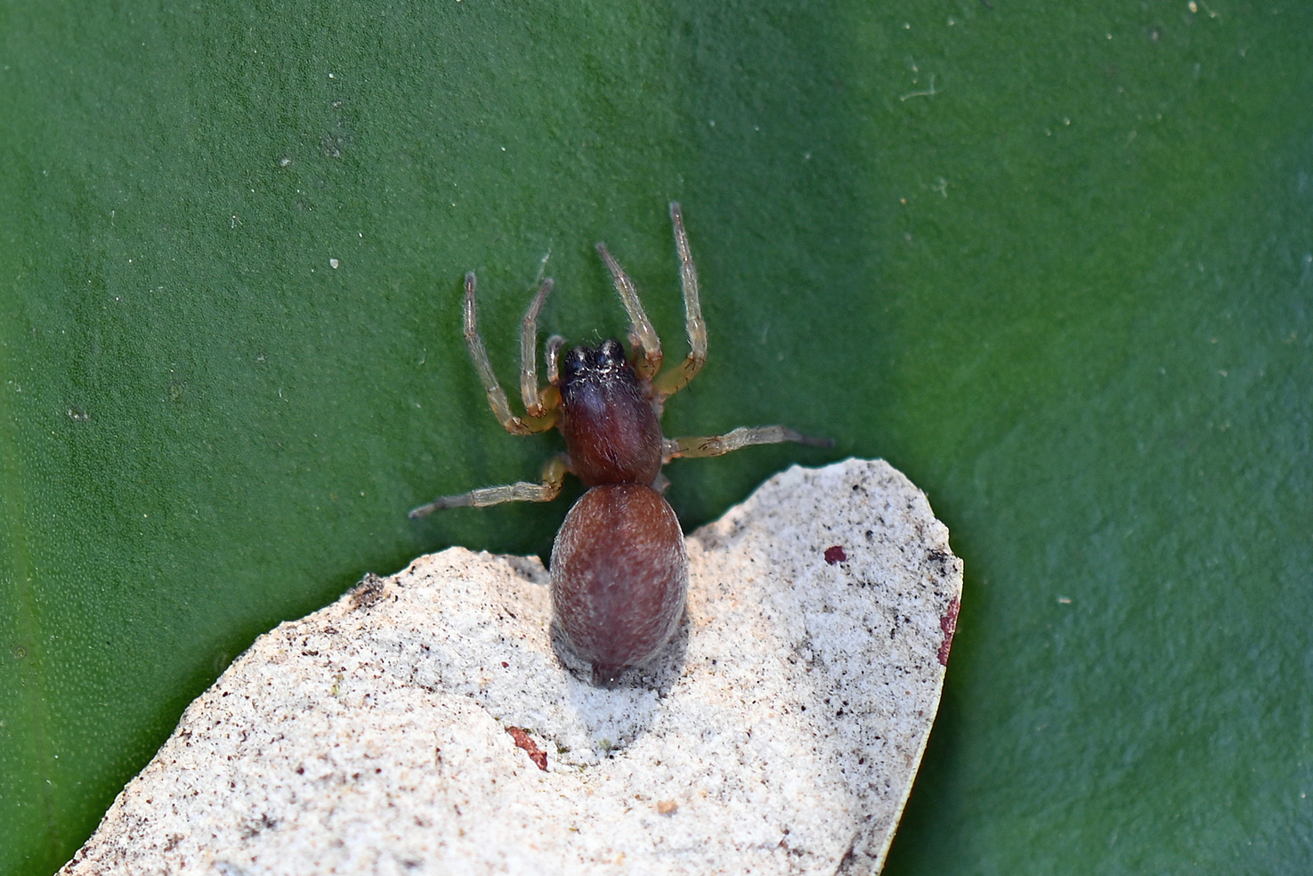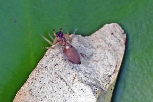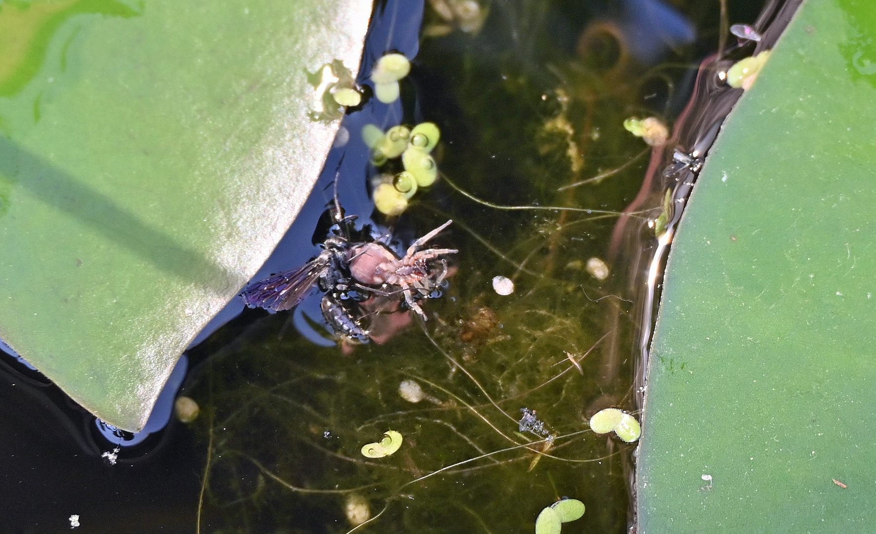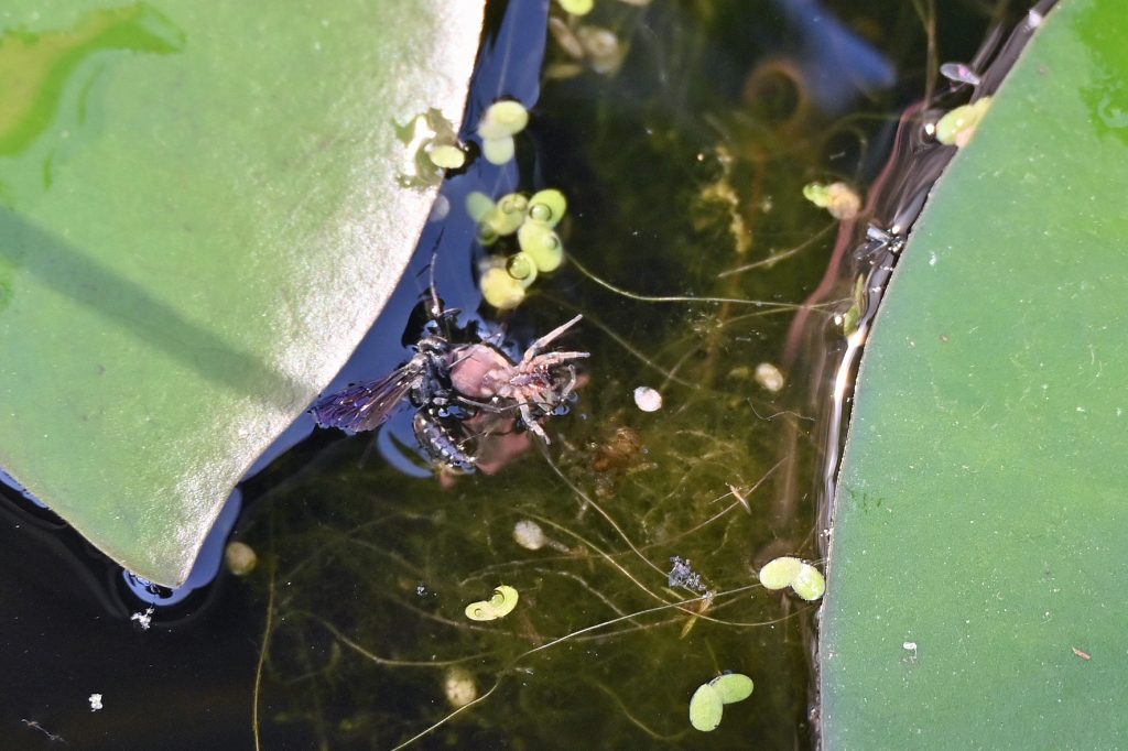 Die Flugzeit der Tönnchenwegwespe (Auplopus carbonarius) ist von Juni bis August. Für die Versorgung der Larven werden Spinnen, z. B. Sackspinnen (Clubionidae), gejagt. Da die Spinnen häufig größer als die Wespen sind, trennt die Wespe für den Transport zumindest einen Teil der Spinnenbeine ab. Die Spinne wird dann an den Spinnwarzen gepackt und vorwärtsgehend abtransportiert. Durch Zufall entdeckte ich eine Tönnchenwegwespe mit erbeuteter Sackspinne, die in den Mini-Teich gefallen waren. Die Tönnchenwegwespe konnte sich selber retten, die Spinne habe ich aus dem Wasser gefischt. Später waren beide Tiere nicht mehr zu entdecken. Ob die Wespe die Spinne noch einmal gepackt hat? Und können Spinnen mit nur 6 Beinen überleben? Ja, sie können.