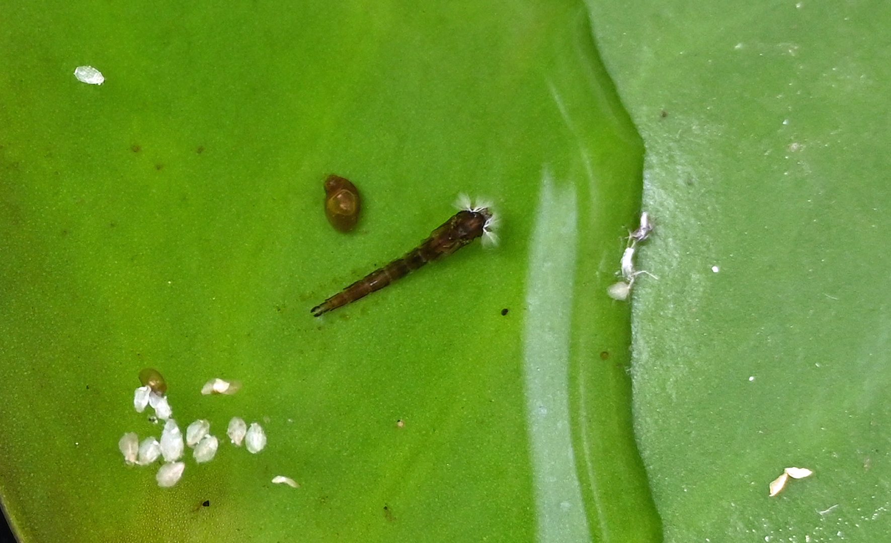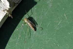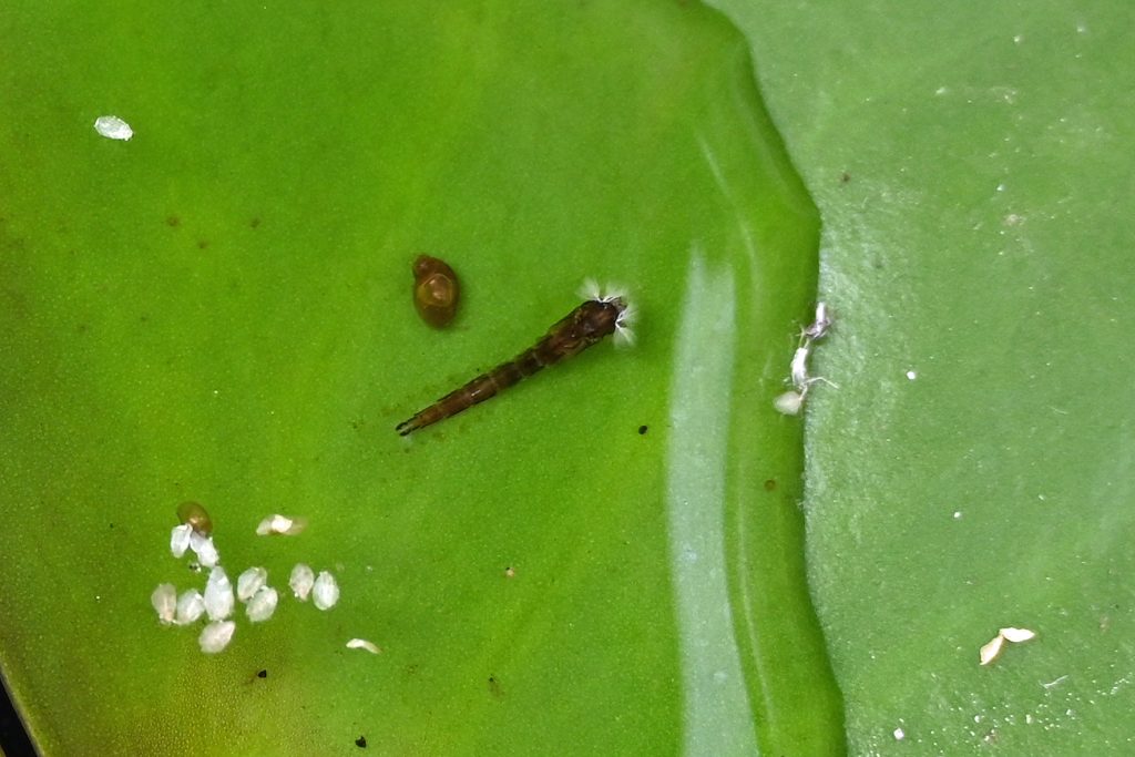 Die Zuckmücken (Chironomidae), auch bekannt als Tanzmücken oder Schwarmmücken, haben eine große Bedeutung in der Nahrungskette, im Garten insbesondere für die Vögel. Die Mundwerkzeuge sind zum Stechen und Blutsaugen nicht geeignet, sie nerven also nicht so wie die Stechmücken. Nektar und Honigtau werden zur Ernährung aufgenommen. Die behaarten Antennen sind gut zur Wahrnehmung von Schwingungen geeignet. In der Regel gibt es pro Jahr nur eine Zuckmücken-Generation. Zur Partnerfindung werden große Tanzschwärme gebildet. Nach der Eiablage schlüpfen die Larven. Im Wasser fallen sie durch ihre schlängelnden Bewegungen auf. Diese führen sie aus, um einen Wasserstrom um den Körper erzeugen, der die Atmung unterstützt. Überwintert wird als Larve. Nach vier Larven-Stadien folgt die nur wenige Tage andauernde Verpuppung. Die frei beweglichen Puppen besitzen Atemhörner mit offener Verbindung zum Tracheensystem. Sie hängen sich zum Atmen an die Wasseroberfläche. Als Schwimmorgan dient ein Haarfächer am letzten Hinterleibssegment. Der Lebenszyklus schließt sich mit den Imagines, die nur ein paar Tage leben.