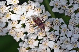 Hellbraune Glasflügelwanze (Rhopalus subrufus), Zimtwanze (Corizus hyoscyami), Punktierte Porenwanze (Stictopleurus punctatonervosus), Porenwanze (Stictopleurus spec.)