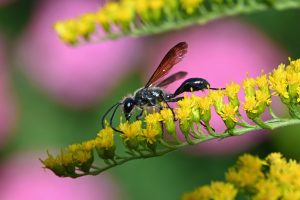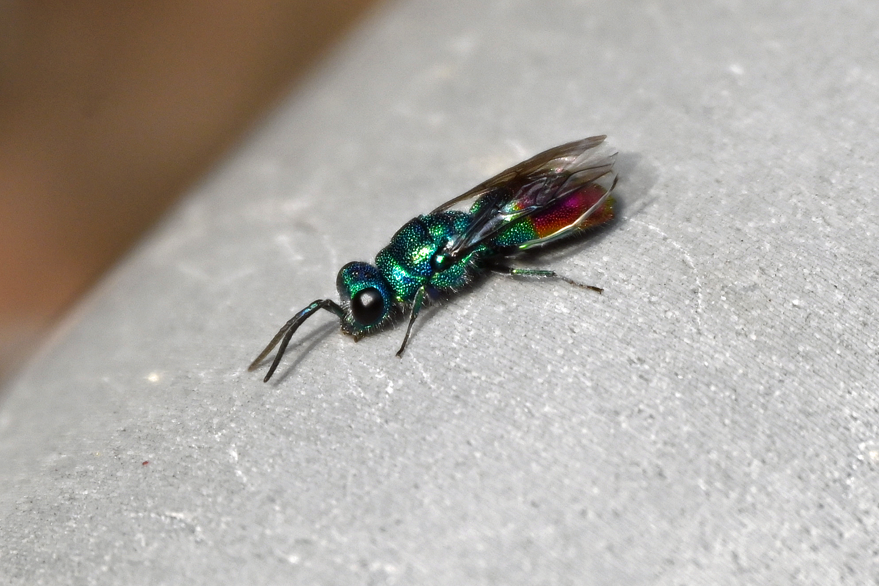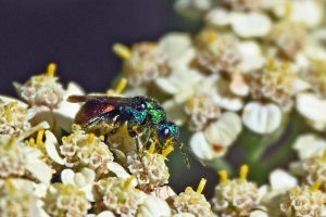 Die Goldwespen (Chrysididae) fallen durch ihre wunderschöne metallisch-glänzende Färbung auf. Die Weibchen der Gemeinen Goldwespe oder Feuer-Goldwespe (Chrysis ignita) legen ihre Eier in Nester solitär lebender Bienen oder Wespen. Ihre Larve frisst zuerst die Wirtslarven und anschließend deren Vorräte. Die Bienenwolf-Goldwespe (Hedychrum rutilans) parasitiert in den Brutkammern des Bienenwolfs. Wo Bienenwölfe vorkommen, findet man auch die Bienen-Goldwespen.