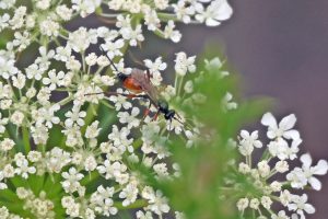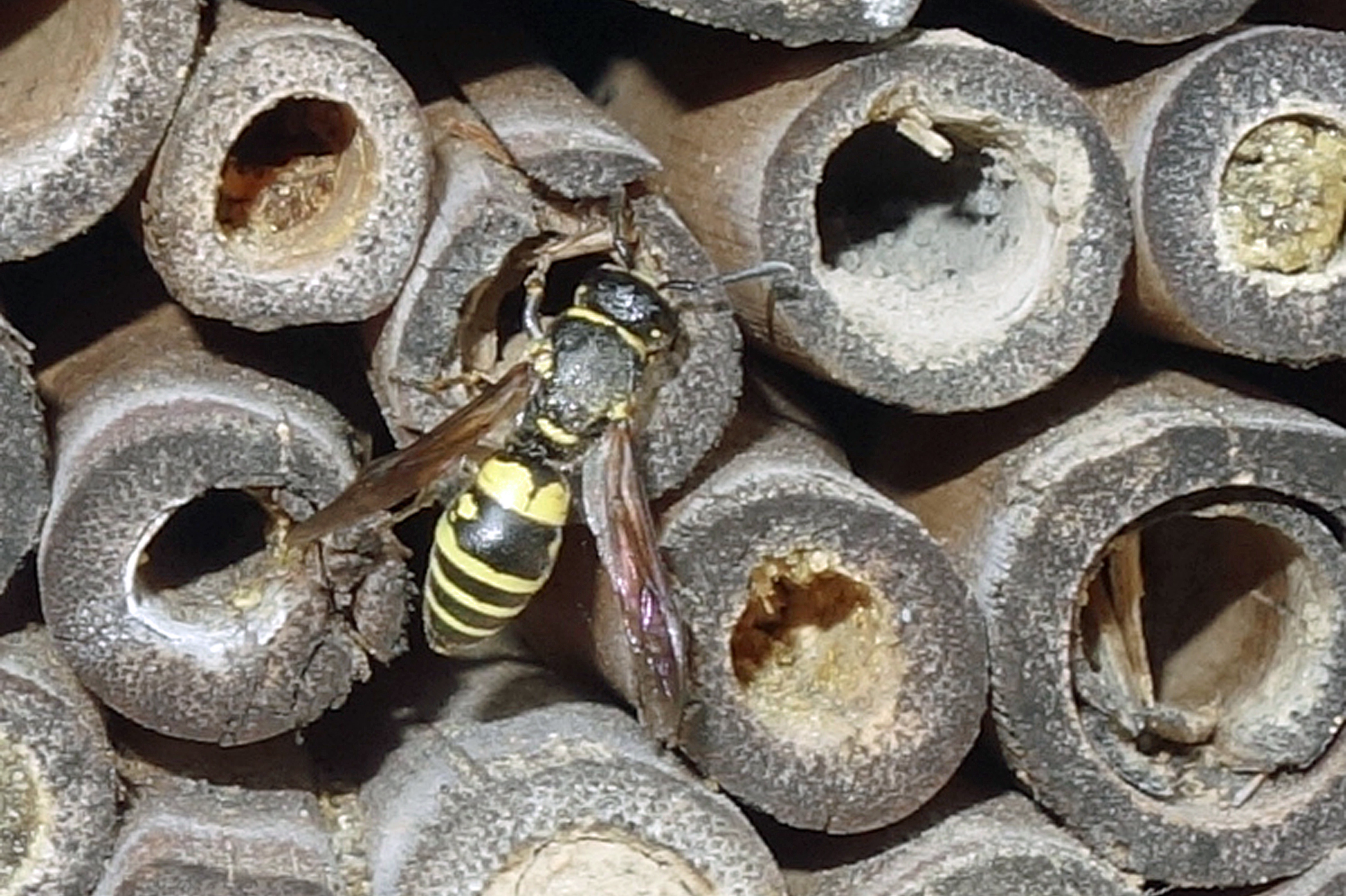 Zur Unterfamilie der Solitären Faltenwespen gehören die Vierbindige Schönwespe (Euodynerus quadrifasciatus), Lehmwespen und andere, die ich nicht näher bestimmen kann.