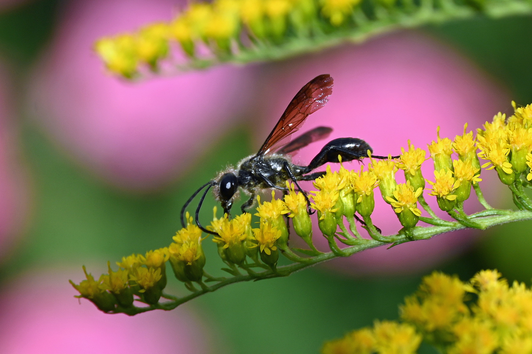 Ähnlich verfahren die Heuschrecken-Sandwespe (Sphex funerarius) und der Stahlblaue Grillenjäger (Isodontia mexicana). Allerdings fangen sie, wie der Name schon sagt, Heuschrecken, und schleppen diese in ihre Brutröhre. Siehe auch Die Heuschrecken-Sandwespe. Die Bienenjagende Knotenwespe (Cerceris rybyensis) hingegen jagt u.a. Furchenbienen und Sandbienen. Und dann gibt es auch noch Knotenwespe (Cerceris spec.), den Großäugige Wanzenjäger (Astata boops) und die Blattlauswespe (Pemphredon spec.)
