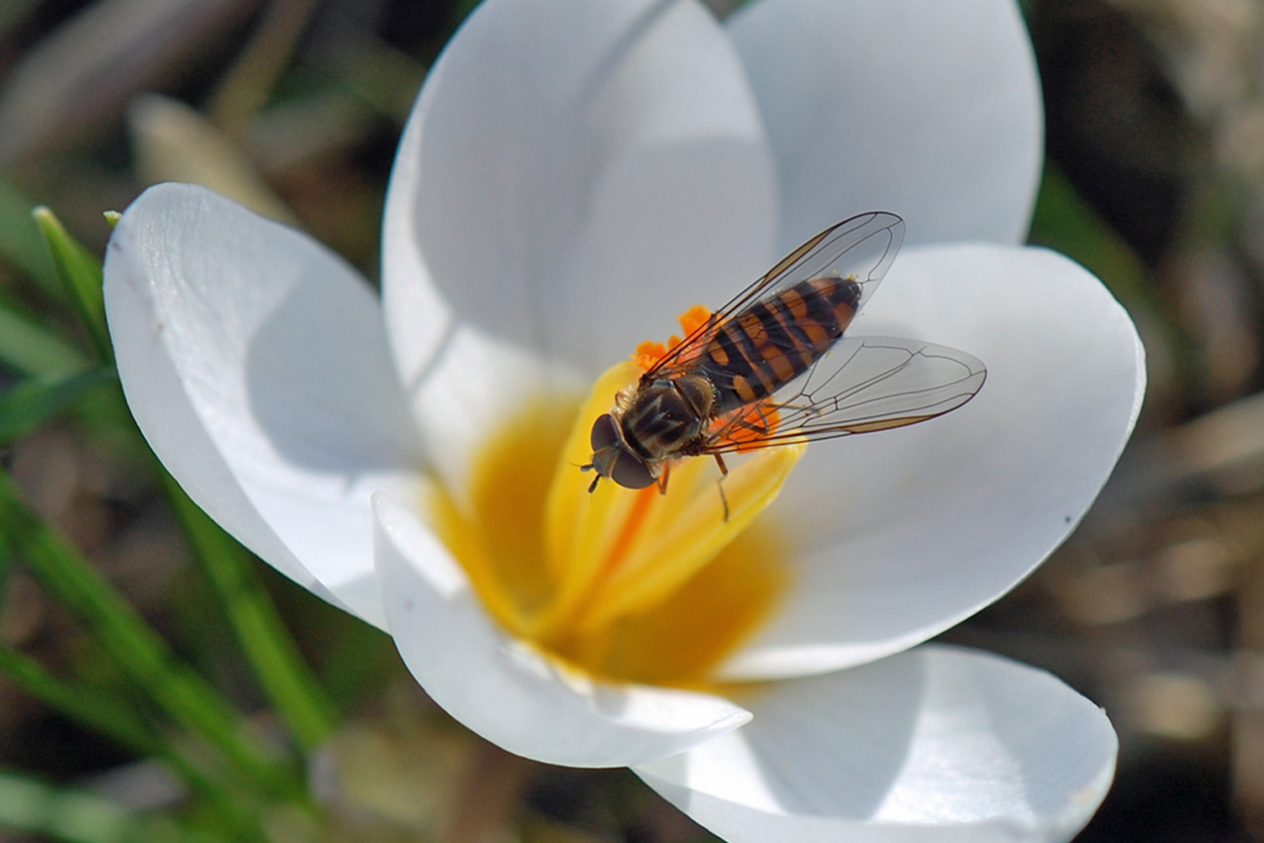 Die Hainschwebfliege (Episyrphus balteatus) gehört zu den Zweiflüglern. Sie besitzt zwei große Vorderflügel. Das hintere Flügelpaar ist zu Schwingkölbchen umgebildet. Die Tiere sind sehr schnell und wendig beim Fliegen, sie können in der Luft stehen oder auch rückwärts zu fliegen.