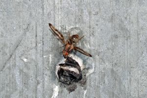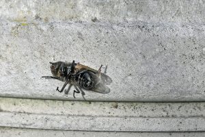 Die Taufliegen (Drosophilidae), auch Fruchtfliegen genannt, kennt wohl jeder aus dem Biologieunterricht und als lästige kleine Fliegen z. B. am Obst. Die Mauerbienen-Fliege (Cacoxenus indagator) aus dieser Familie ist ein Futterparasit. Sie tummeln sich am Insektenhotel und warten darauf, dass eine der Rostroten Mauerbienen (Osmia bicornis) ihre noch offene Brutzelle verlässt. Sofort schlüpft dann die Mauerbienen-Fliege hinein und legt ihre Eier ab. Die später geschlüpften Fliegen-Larven ernähren sich von den Pollen- und Nektarvorräten, die die Mauerbiene für den eigenen Nachwuchs angelegt hat. Mit etwas Glück reichen die Vorräte für alle. Die fertig entwickelten Mauerbienen-Fliegen ernähren sich dann wie alle Taufliegen von überreifem Obst und gärenden Fruchtsäften.
