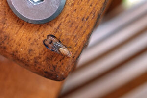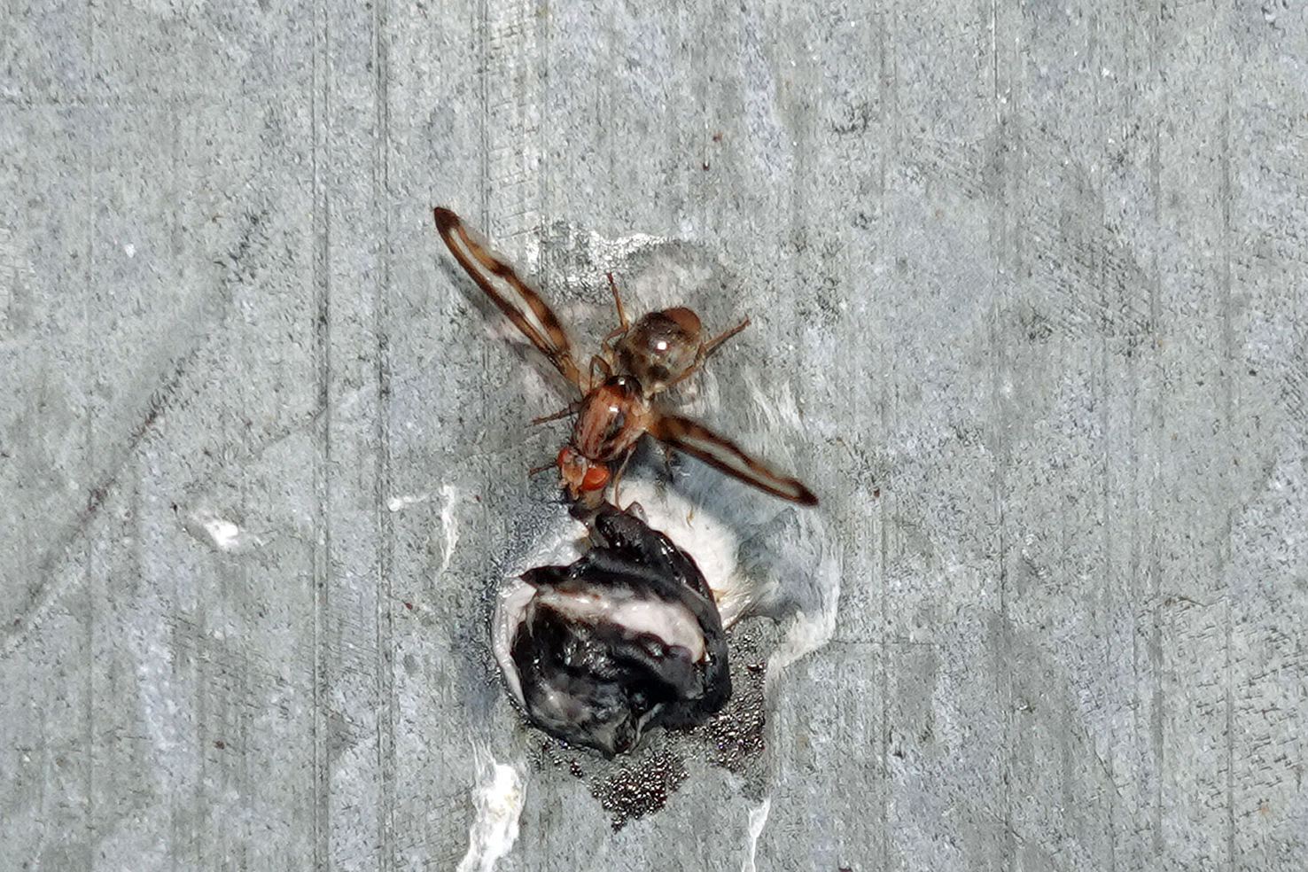 Die Taufliegen (Drosophilidae), auch Fruchtfliegen genannt, kennt wohl jeder aus dem Biologieunterricht und als lästige kleine Fliegen z. B. am Obst. Die Mauerbienen-Fliege (Cacoxenus indagator) aus dieser Familie ist ein Futterparasit. Sie tummeln sich am Insektenhotel und warten darauf, dass eine der Rostroten Mauerbienen (Osmia bicornis) ihre noch offene Brutzelle verlässt. Sofort schlüpft dann die Mauerbienen-Fliege hinein und legt ihre Eier ab. Die später geschlüpften Fliegen-Larven ernähren sich von den Pollen- und Nektarvorräten, die die Mauerbiene für den eigenen Nachwuchs angelegt hat. Mit etwas Glück reichen die Vorräte für alle. Die fertig entwickelten Mauerbienen-Fliegen ernähren sich dann wie alle Taufliegen von überreifem Obst und gärenden Fruchtsäften.