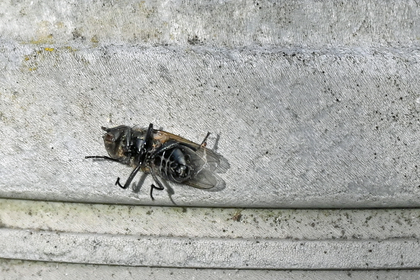 Deutlich ist der aufgeblasen wirkende Kopf zu erkennen. Die Blasenkopffliegen sind Parasiten. Ihre Larven entwickeln sich hauptsächlich in Hummeln und Wespen.